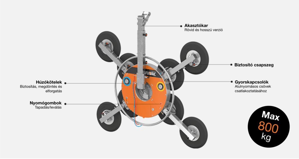 Különböző méretű üvegeket kell beépítenie a helyszínen? Vegye igénybe a VIAVAC GBX üvegtapadókorongjaink segítségét, és pillanatok alatt kész lesz. Egyszerűen akassza a készüléket egy darura vagy más emelőeszközre, és máris akár 800 kg-os üvegtáblákat is emelhet. Az egész egység a praktikus szállítódobozban könnyen szállítható az építkezés helyszínére.